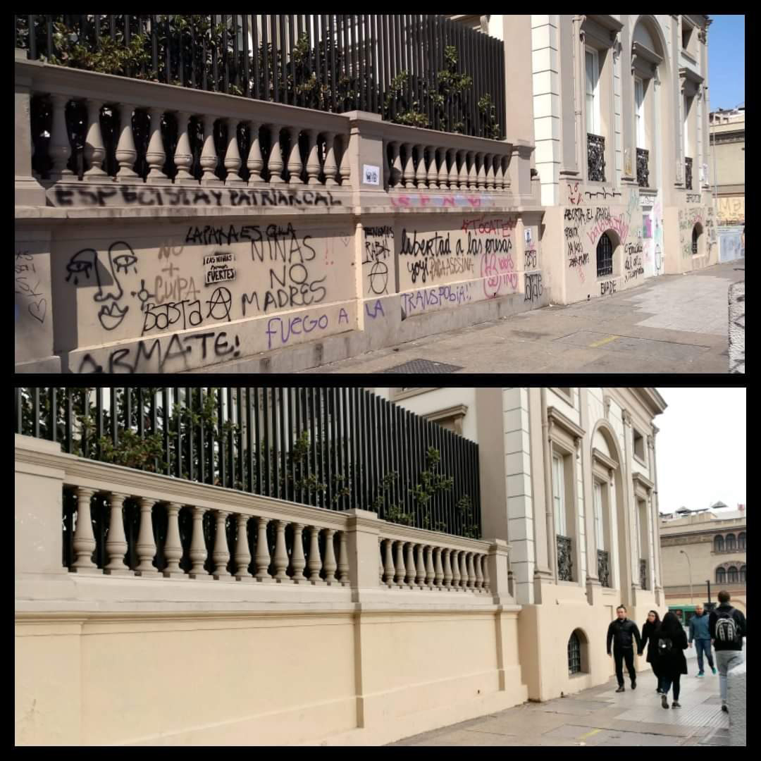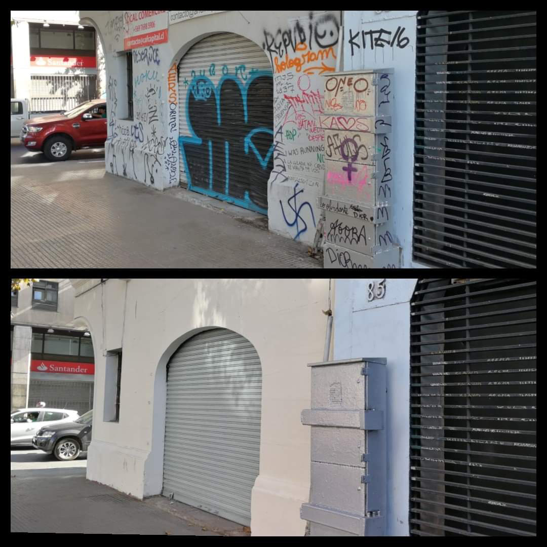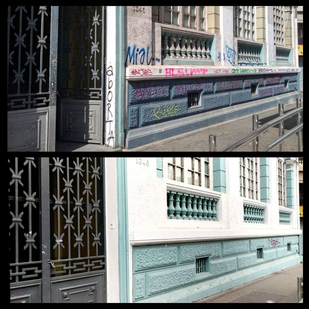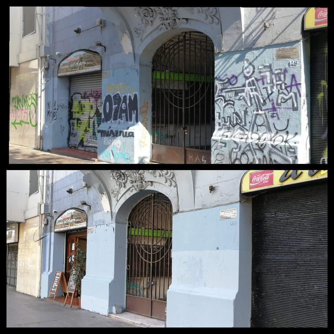 Tengo la sensación que la gente ya está con ganas de recuperar sus edificios, sus casas, se nota más movimiento. Además que salió este anuncio de la gobernación de recuperación de la Alameda y lo de los municipios de Providencia y Santiago que prometen recuperar los alrededores de Baquedano. Nosotros estuvimos mucho tiempo trabajando con la limpieza de fachadas. Empezamos con la entonces alcaldesa Carolina Tohá. Limpiamos las fachadas de la Alameda desde Vicuña Mackenna hasta Matucana y después nos quedamos con mantenimiento como cuatro años y medio. Pero tras el estallido fue imposible seguir limpiando, era impracticable. Limpiábamos y pintábamos, no poníamos antigrafiti porque los costos eran muy altos.