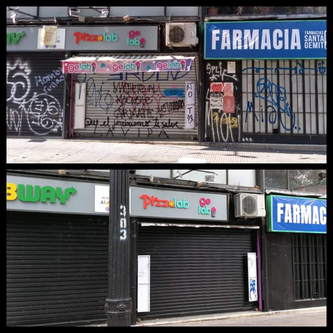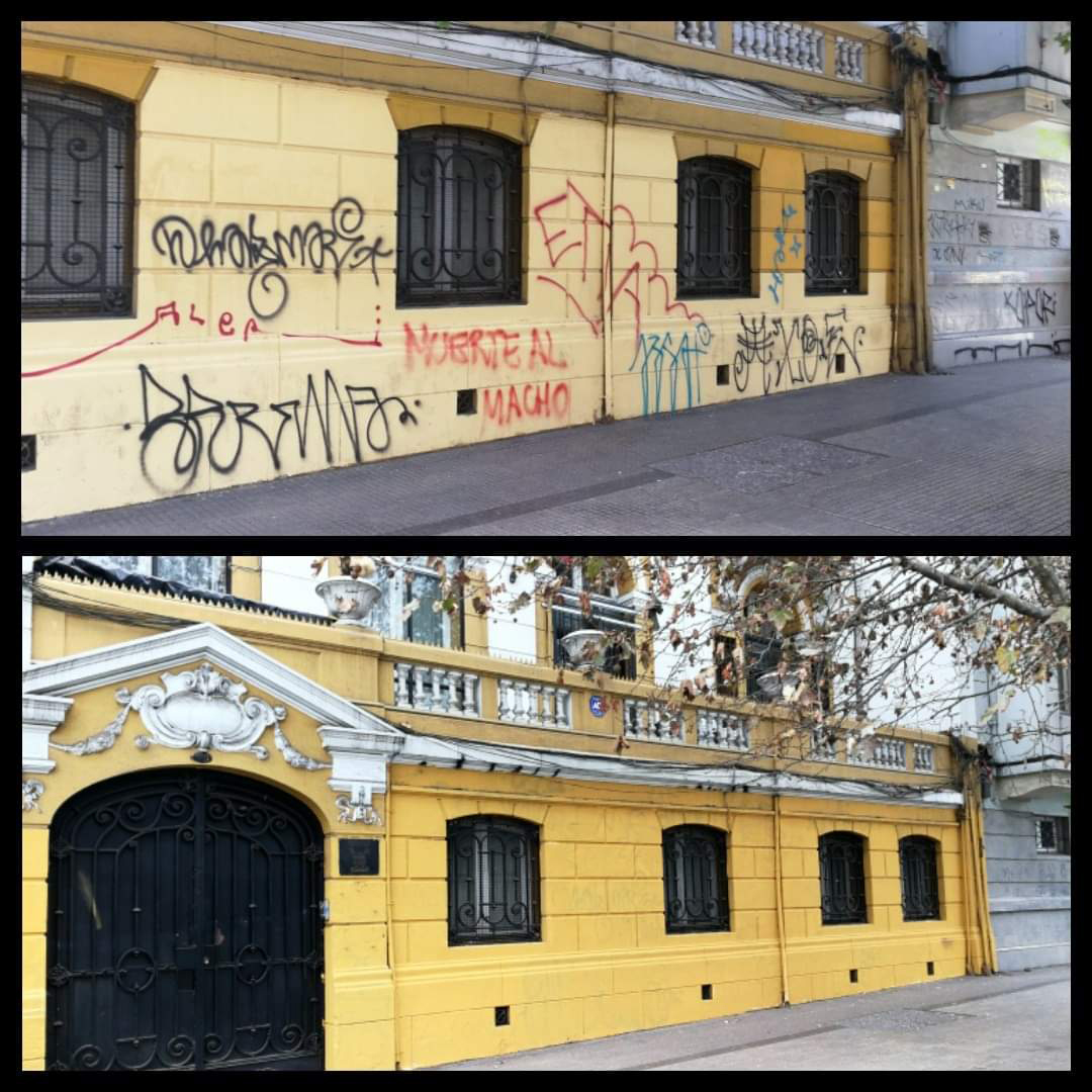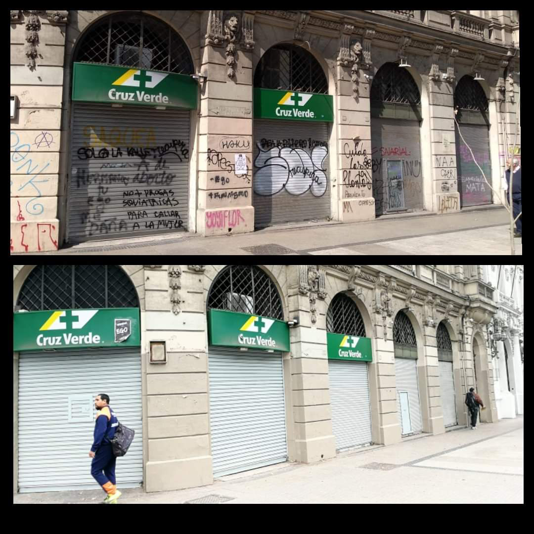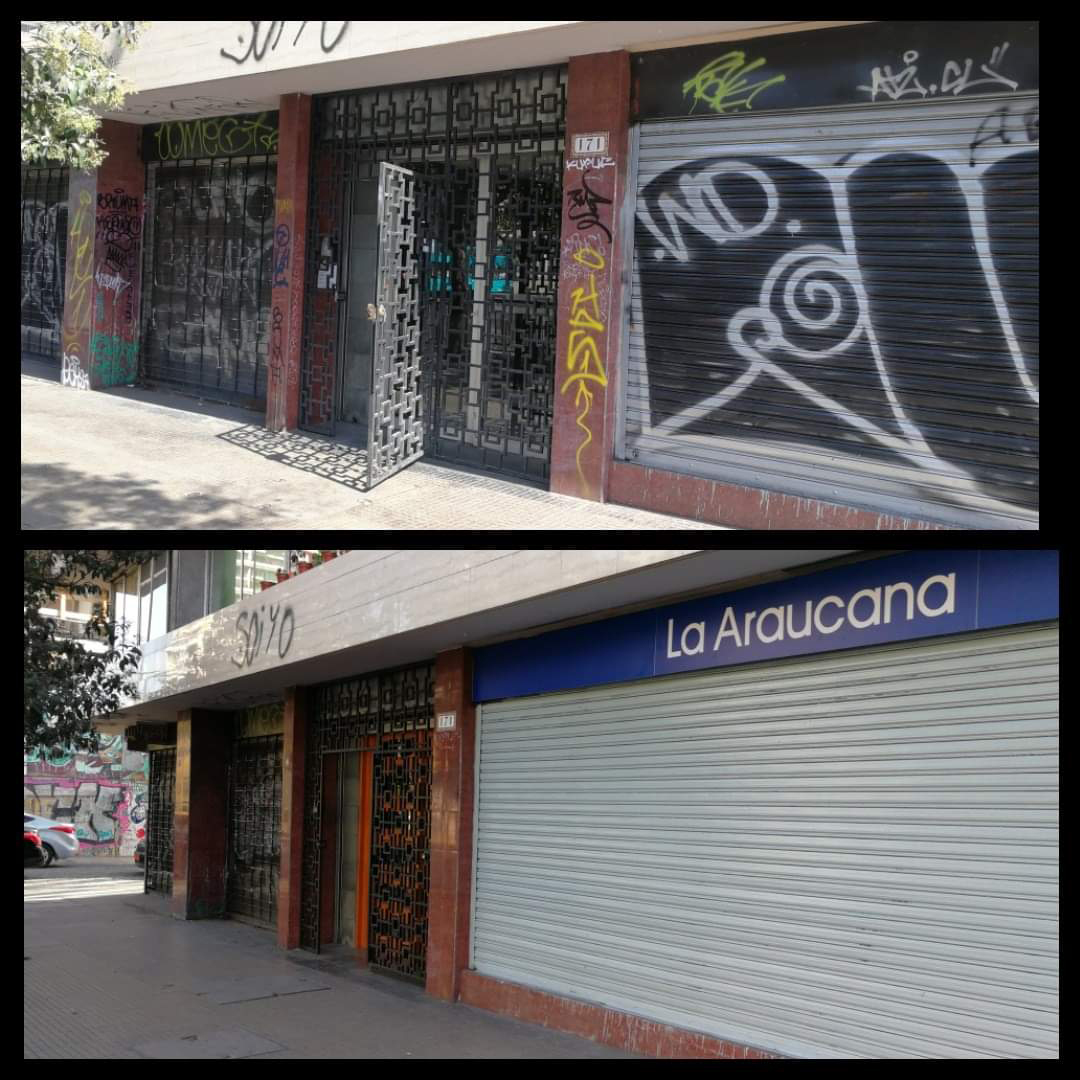 Tengo la sensación que la gente ya está con ganas de recuperar sus edificios, sus casas, se nota más movimiento. Además que salió este anuncio de la gobernación de recuperación de la Alameda y lo de los municipios de Providencia y Santiago que prometen recuperar los alrededores de Baquedano. Nosotros estuvimos mucho tiempo trabajando con la limpieza de fachadas. Empezamos con la entonces alcaldesa Carolina Tohá. Limpiamos las fachadas de la Alameda desde Vicuña Mackenna hasta Matucana y después nos quedamos con mantenimiento como cuatro años y medio. Pero tras el estallido fue imposible seguir limpiando, era impracticable. Limpiábamos y pintábamos, no poníamos antigrafiti porque los costos eran muy altos.