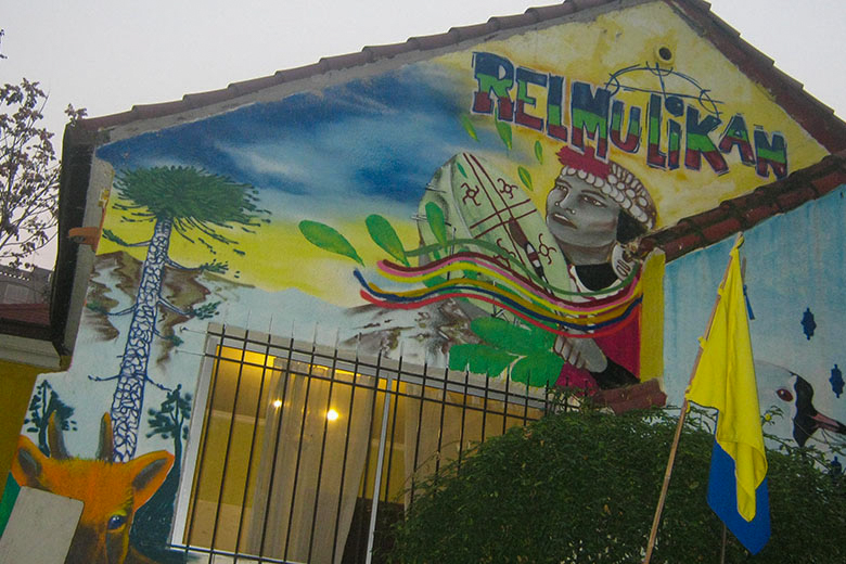 Santiago warria está en rimu (otoño) y también los árboles, las hojas, las pequeñas posas de agua desperdigadas después de varios días de lluvia. A mis manos llega el número telefónico de una de las jóvenes del hogar Relmulikan, que en mapudungun significa piedra de arcoiris, donde residen solamente estudiantes mapuche. La llamo y me invita a asistir, junto a otros invitados, a su asamblea dominical. El apacible jardín y su fachada repleta de murales me recuerdan el gran paisaje del Wallmapu (territorio mapuche).