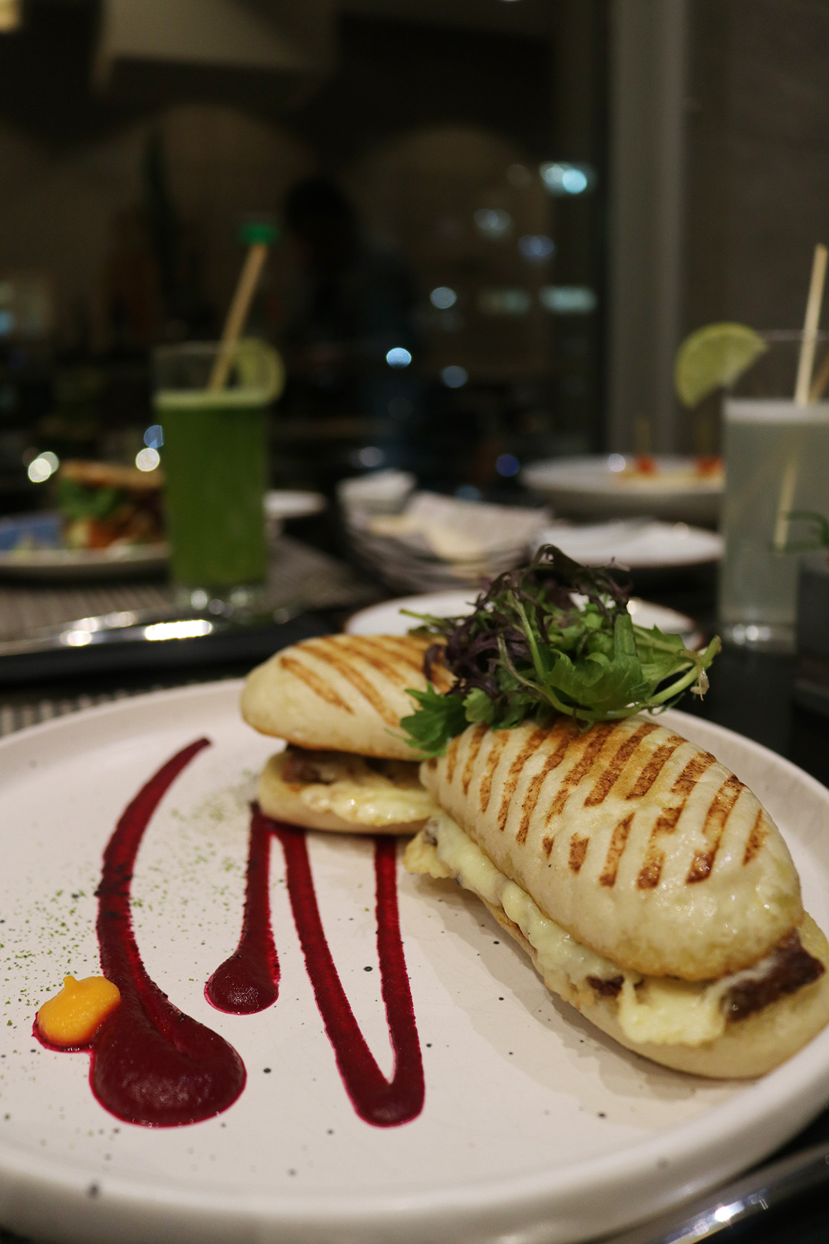 En el nuevo menú de sándwiches encuentras un Barros Luco preparado en un panini con un filete marinado en ajo, romero y aceite de humo que deja la carne perfumada a la brasas, acompañado de queso fundido y decoraciones de betarraga y zanahoria.