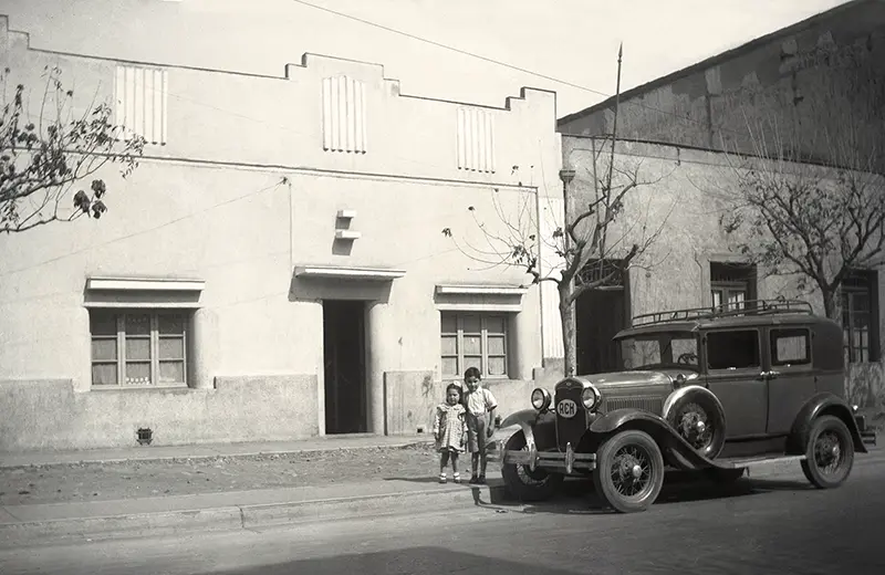 © Archivo Brügmann: En un tradicional barrio de Santiago con casas de fachada continua, dos niños posan junto a un antiguo auto Ford A, en la década de 1940.