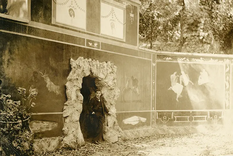 © Archivo Brügmann: Niño en el Parque Arrieta en Peñalolén, famoso por sus fuentes de agua y diversas estructuras de inspiración italiana ocultas entre los jardines, como este espectacular patio pompeyano decorado con frescos. Década 1890.