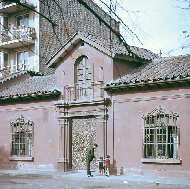 © Archivo Brügmann: Un padre con sus dos hijas frente a la casa de Huérfanos 2120, en la Plaza Brasil de Santiago; c.1960.