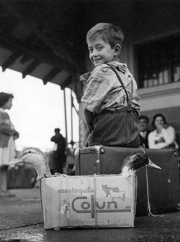 © Archivo Brügmann: Niño sentado sobre su maleta, junto a una caja con dos patos, c.1960.