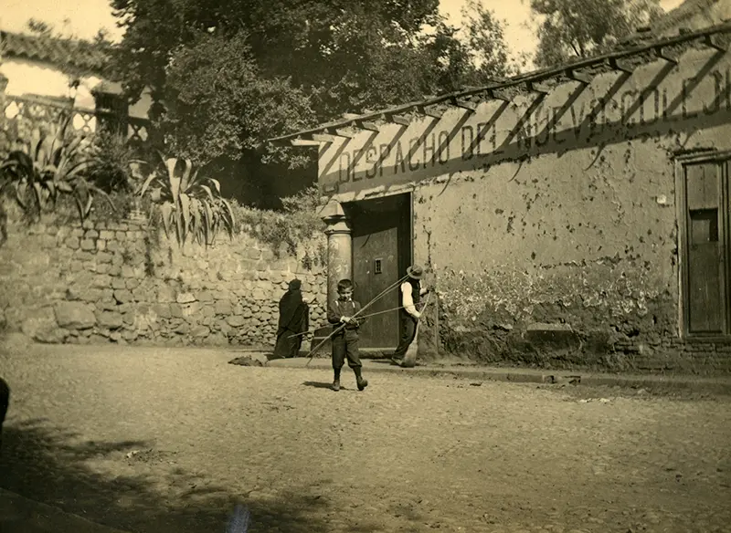 © Archivo Brügmann: Un niño sosteniendo varillas es el personaje principal en esta fotografía tomada en calle Rosal con Victoria Subercaseaux. Al fondo se ve el cerro Santa Lucía y llama la atención una antigua casa con pilar en la esquina. Año 1905.
