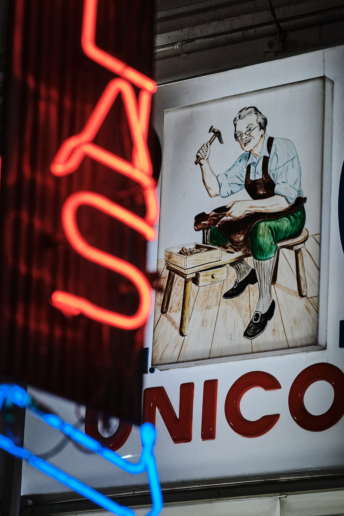 Los talleres de “El Griego” funcionan en el segundo piso de Galería Edwards, en donde se reparan zapatos, carteras y chaquetas. Fotografía de Claudio Olivares Medina. Noviembre 2025.