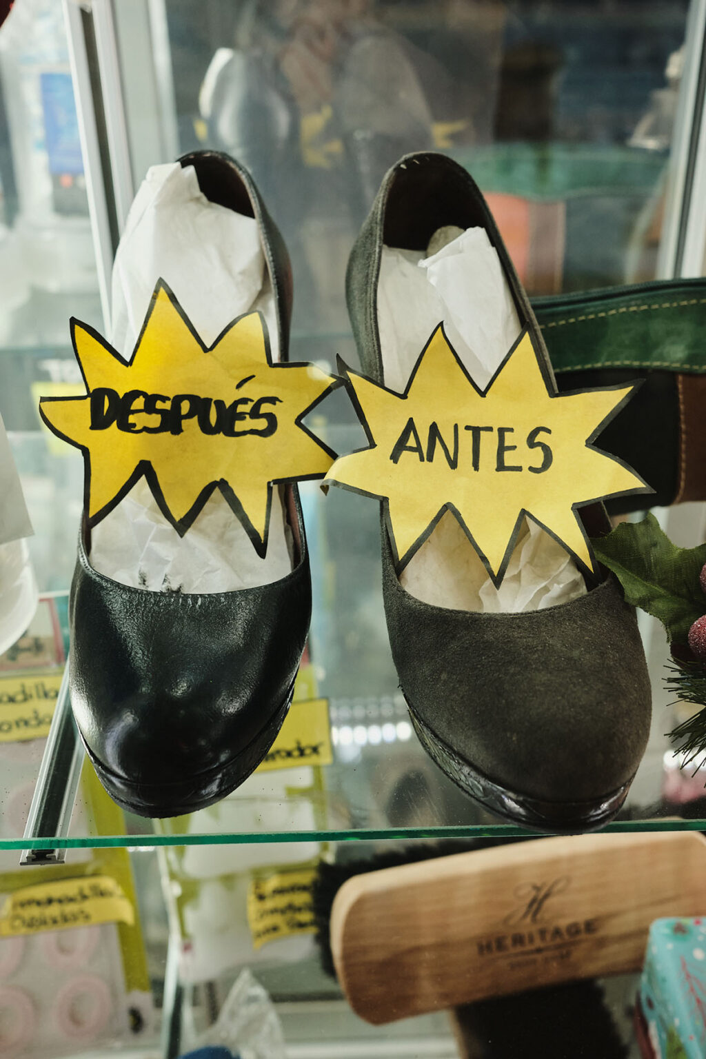 Totalmente. Todo lo que es suelas, plantas, tapillas, parches, plantillas, teñidos, hormas… eso se mantiene por tradición. Detrás de nosotros hay maestros zapateros y marroquineros, gente muy experta. Nosotras también hacemos muchas cosas, no somos solo vendedoras. Todas participamos del trabajo. Detrás de este delantal hay grandes mujeres.